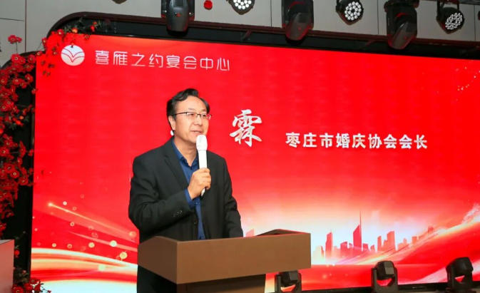 山東省婚慶協會副會長、棗莊市婚慶協會會長張霖發表致辭,對“喜雁之約”的周年慶典表示熱烈祝賀,同時寄語中心未來能持續深耕創新,不斷打磨產品與服務,為消費者帶來更具質感的宴會體驗,助力棗莊婚慶宴會行業邁向更高質量的發展階段。