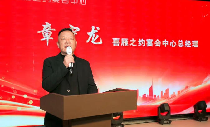 隨后,各項重磅議程有序推進。喜雁之約宴會中心總經理章守龍先生登臺,以真誠而詳實的分享,全面復盤了中心過去一年的運營成果——從服務體系的迭代升級、市場口碑的持續積累,到品牌影響力的穩步拓展,一串串亮眼數據、一個個里程碑事件,充分展現了“喜雁之約”的硬核實力。同時,章總還重磅公布了未來一年的發展規劃,明確了在服務創新、場景升級、生態構建等方面的核心方向,彰顯出中心在宴會服務領域深耕細作、持續領跑的決心與底氣,贏得現場陣陣熱烈掌聲。