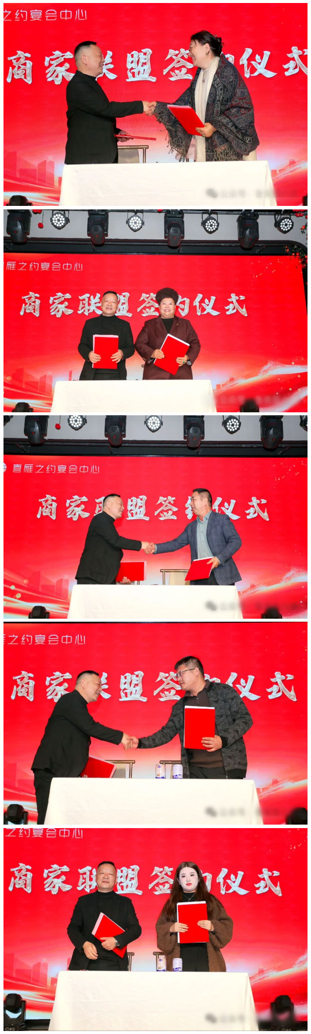 發布會現場亮點紛呈,一場隆重的合作簽約儀式備受矚目。喜雁之約宴會中心與銀河珠寶、蘇菲瑪索婚紗攝影、報喜鳥男裝、露露飲料、開元曼居酒店等本地優質異業商家企業正式簽署合作協議,雙方代表握手合影,定格下互利共贏的重要時刻。此次跨界聯盟,旨在整合各方核心優勢資源,構建覆蓋宴會全鏈條的服務生態,為消費者提供更全面、更便捷、更優質的一站式解決方案,開啟行業協同發展的嶄新篇章。