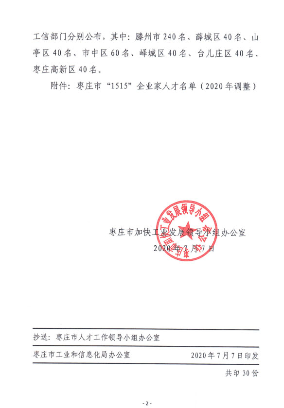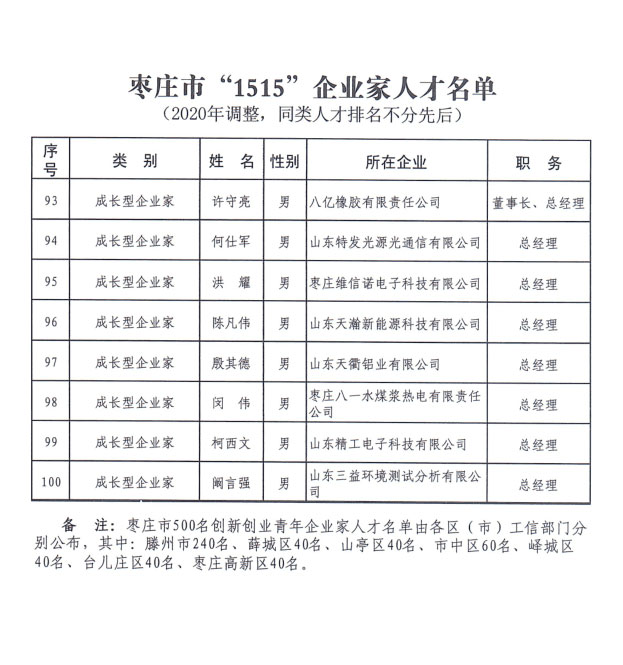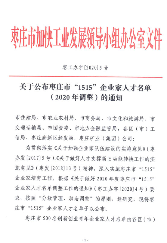 近日,棗莊市加快工業發展領導小組辦公室發布棗莊市“1515”企業家人才名單,棗莊市共500名創新創業青年企業家人才名單由各區(市)工信部門分別公布,其中:滕州市240名、薛城區40名、山亭區40名、市中區60名、嶧城區40名、臺兒莊區40名、棗莊高新區40名。