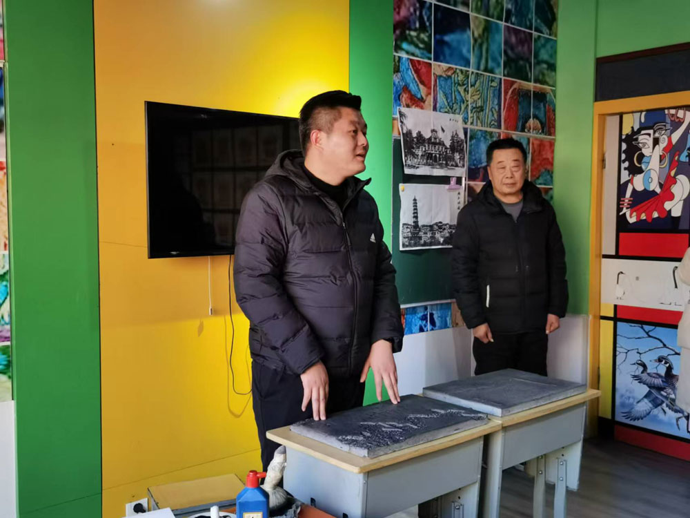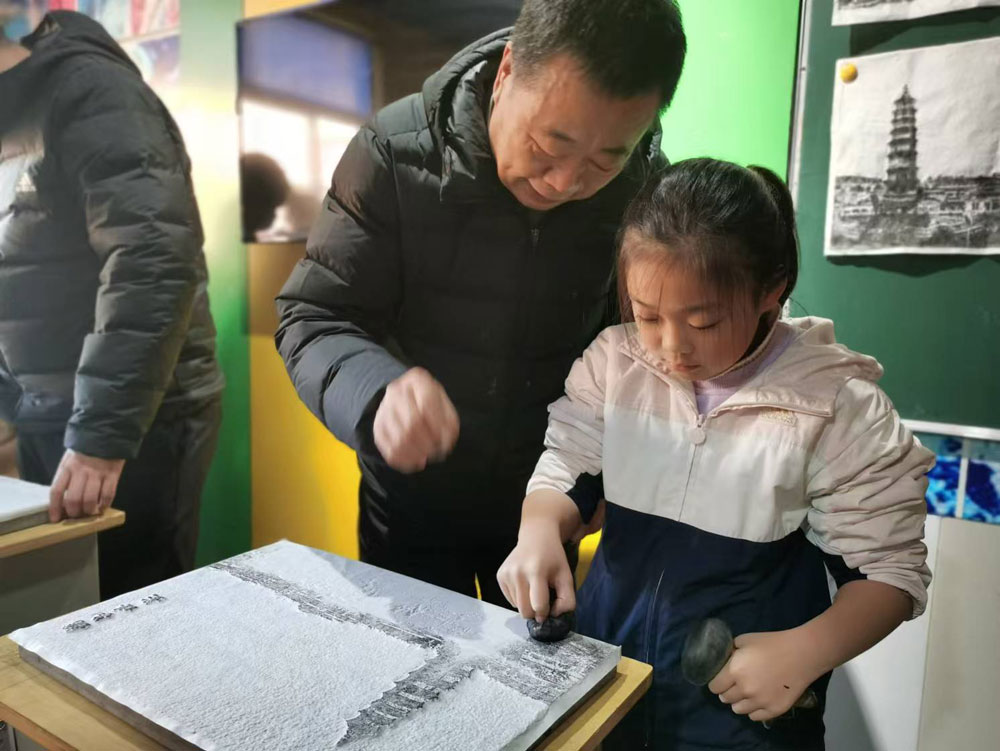 活動現場,市級面泥塑非遺傳承人闞宗勤先生、張婷女士,著名書法家、金石拓片專家盧緒寶先生、張奇先生紛紛走進教室,向學生們展示了精湛的技藝。面塑藝人巧手揉捏,一個個色彩鮮艷、造型可愛的面人便呈現在孩子們眼前;拓片專家展示了享譽全國的《棗莊八景藝文圖卷》,講述了它的誕生歷程,并演示拓片制作技藝,讓孩子們沉醉其中。