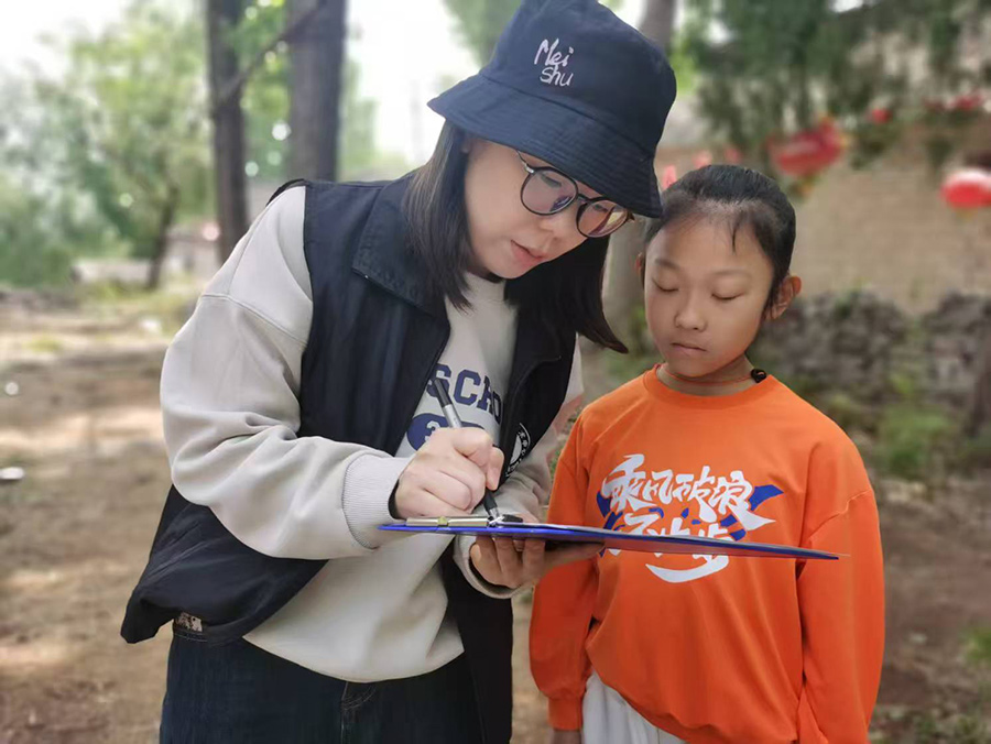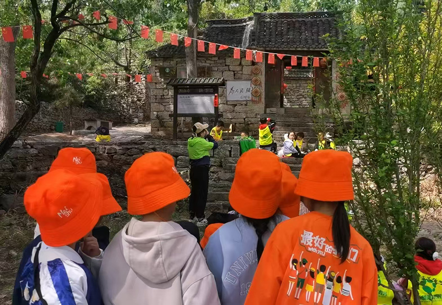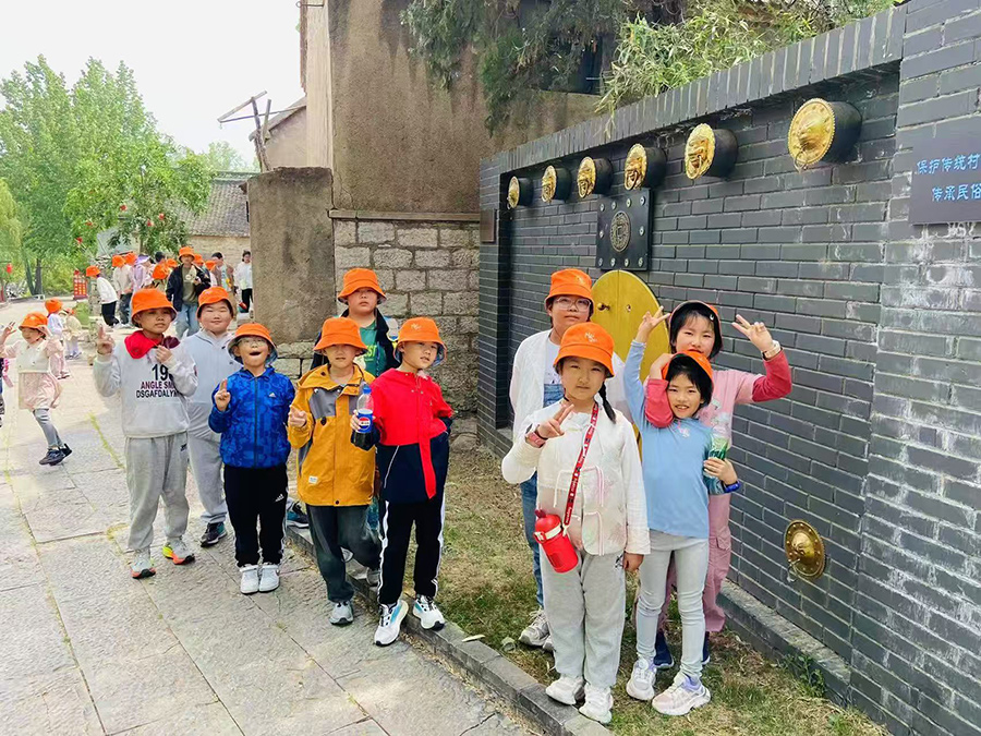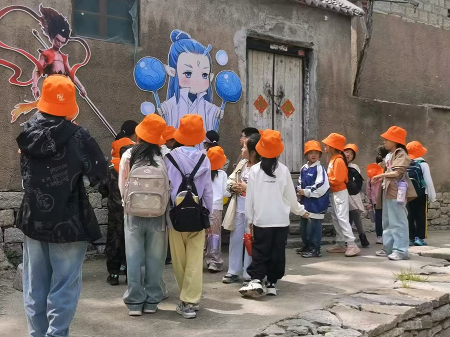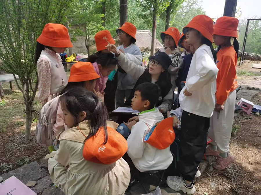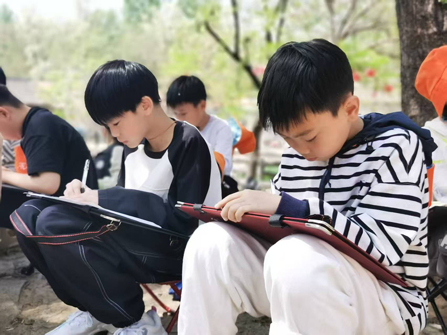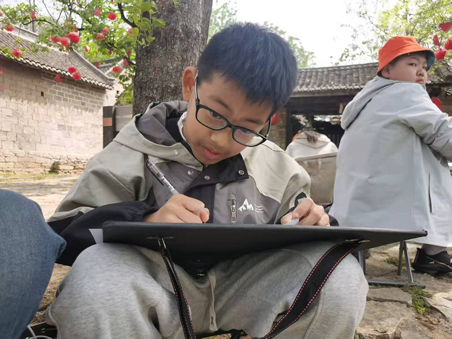 上九山古村歷史悠久,石屋、石墻、石板路錯落有致,充滿古樸韻味。一抵達目的地,孩子們就被古村的獨特景致深深吸引。在老師們的帶領下,大家有序地尋找各自心儀的寫生地點。有的孩子被斑駁的古墻吸引,有的則對古舊的門窗情有獨鐘,還有的醉心于古村春日里綻放的花朵與嫩綠的新芽。