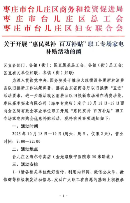 關于開展“惠民雙補 百萬補貼”職工專場家電補貼活動的通知