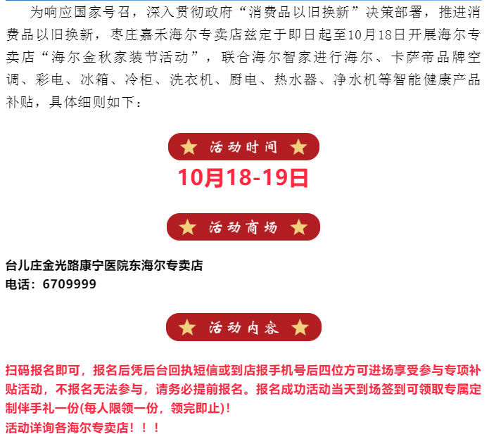10月18日-19日海爾專賣店“惠民雙補 百萬補貼“職工專場家電內購會!邀您蒞臨!!!