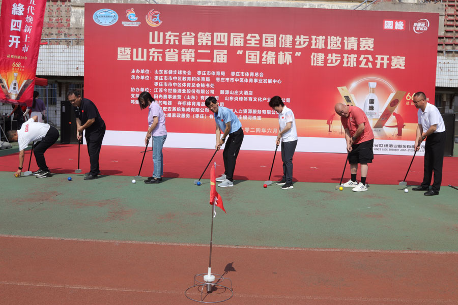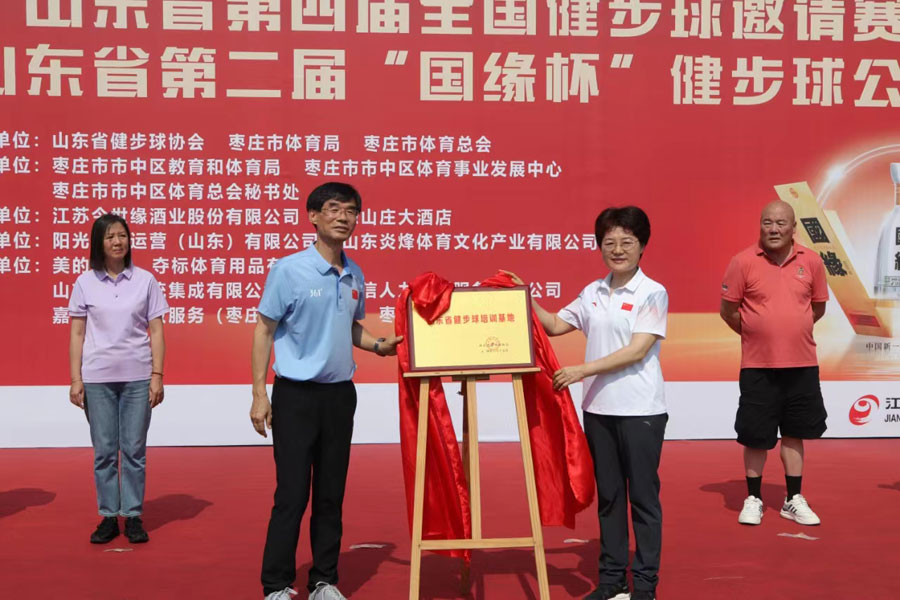 6月15日上午,由山東省健步球協(xié)會、棗莊市體育局、棗莊市體育總會主辦,市中區(qū)教育和體育局、市中區(qū)體育事業(yè)發(fā)展中心、市中區(qū)體育總會秘書處承辦,江蘇今世緣酒業(yè)股份有限公司、頤園山莊大酒店、陽光賽事運營(山東)有限公司、山東炎烽體育文化產(chǎn)業(yè)有限公司、棗莊銀河珠寶、山東宏安系統(tǒng)集成有限公司、棗莊君信人力資源服務有限公司、嘉新大姐家政服務棗莊有限公司、奪標體育用品有限公司、美的電器、棗莊牙博士口腔 、真善美攝影裝裱廣告部聯(lián)合協(xié)辦的山東省第四屆全國健步球邀請賽暨山東省第二屆“國緣杯”健步球公開賽在棗莊老城體育場揚桿開賽,山東省健步球協(xié)會會長、山東體育學院教授張基振,上海市健步球代表團團長高漢澤,內(nèi)蒙古健步球代表團團長朝克圖,棗莊市體育局局長林捷,棗莊市體育局黨級成員、市競技體育發(fā)展中心主任張濤等出席開幕式致辭,張基振、林捷為棗莊市頤園山莊“山東省健步球培訓基地”揭牌。